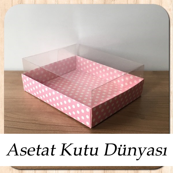 12x15x5 ölçülü pembe zemin beyaz puantiyeli altı karton üstü asetat kutumuzu buradan inceleyebilirsiniz.